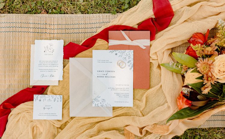 This styled shoot, featuring real life couple Grace & Kodee was pure joy: bold autumn colours, down-to-earth orchard wedding vibes and effortless style from our two brides. This shoot features the Bailey suite — one of the Semi-Custom designs in my Invitation Collection.